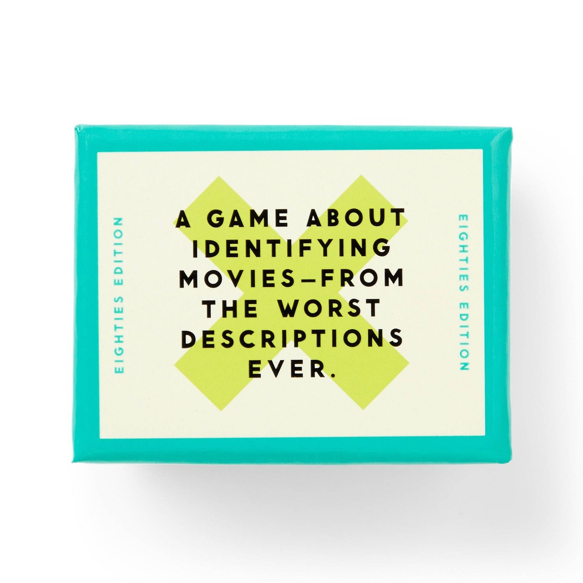 A party game all about identifying movies–from the worst descriptions humanly possible. Features 125 game cards–each featuring a uniquely-terrible description of an 80s movie. Includes instructions for two distinct ways to play (competitive & casual). Suitable for 2 to 8 players. Enjoy the game on the go or expand your original edition!