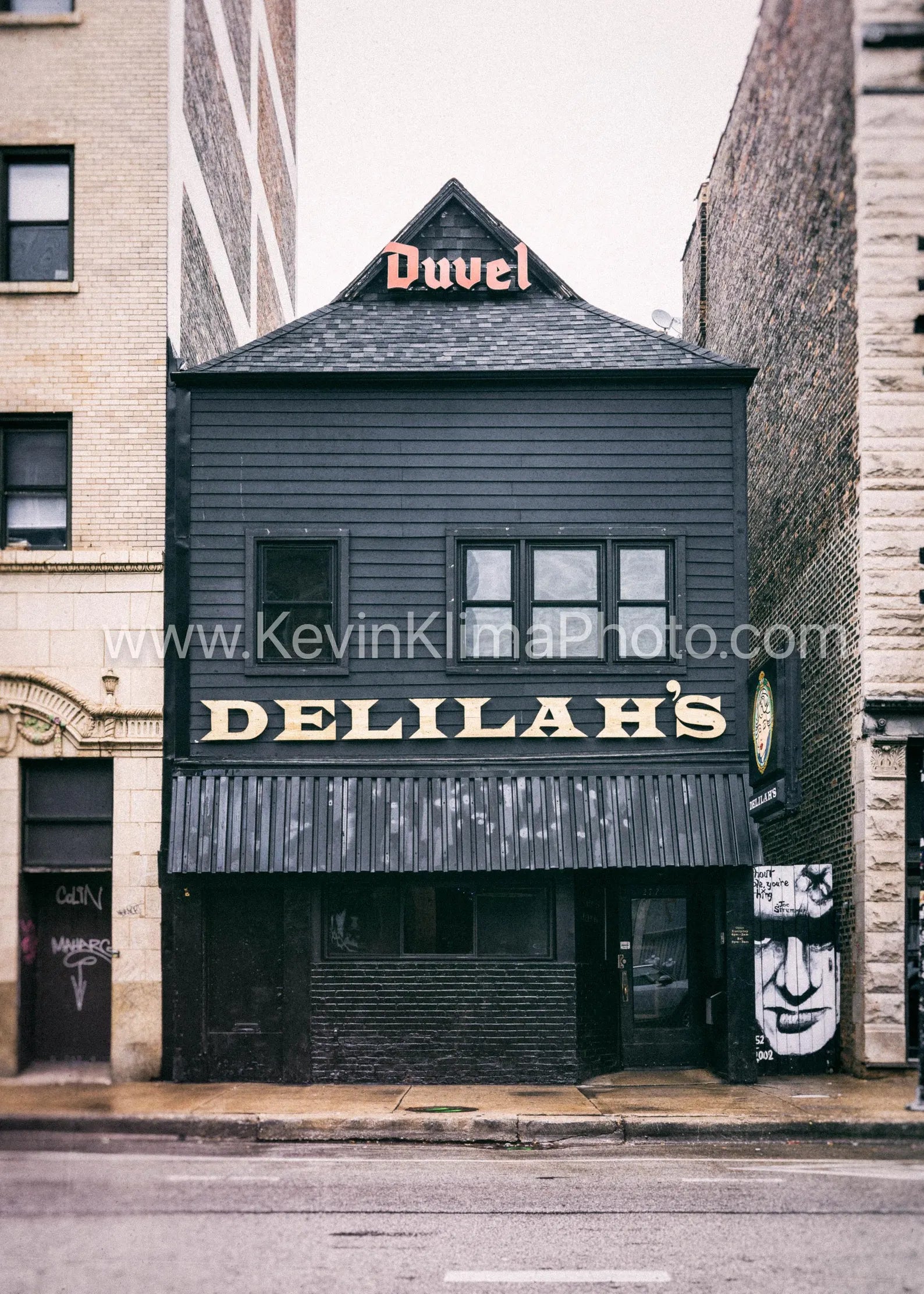 Captured by Kevin Klima, this photograph freezes a moment outside one of Chicago’s most beloved rock ‘n’ roll watering holes. Delilah’s, with its deep black facade and bold gold-lettered sign at 2771 N Lincoln Avenue, has been luring in music lovers, whiskey connoisseurs, and night owls since 1993.