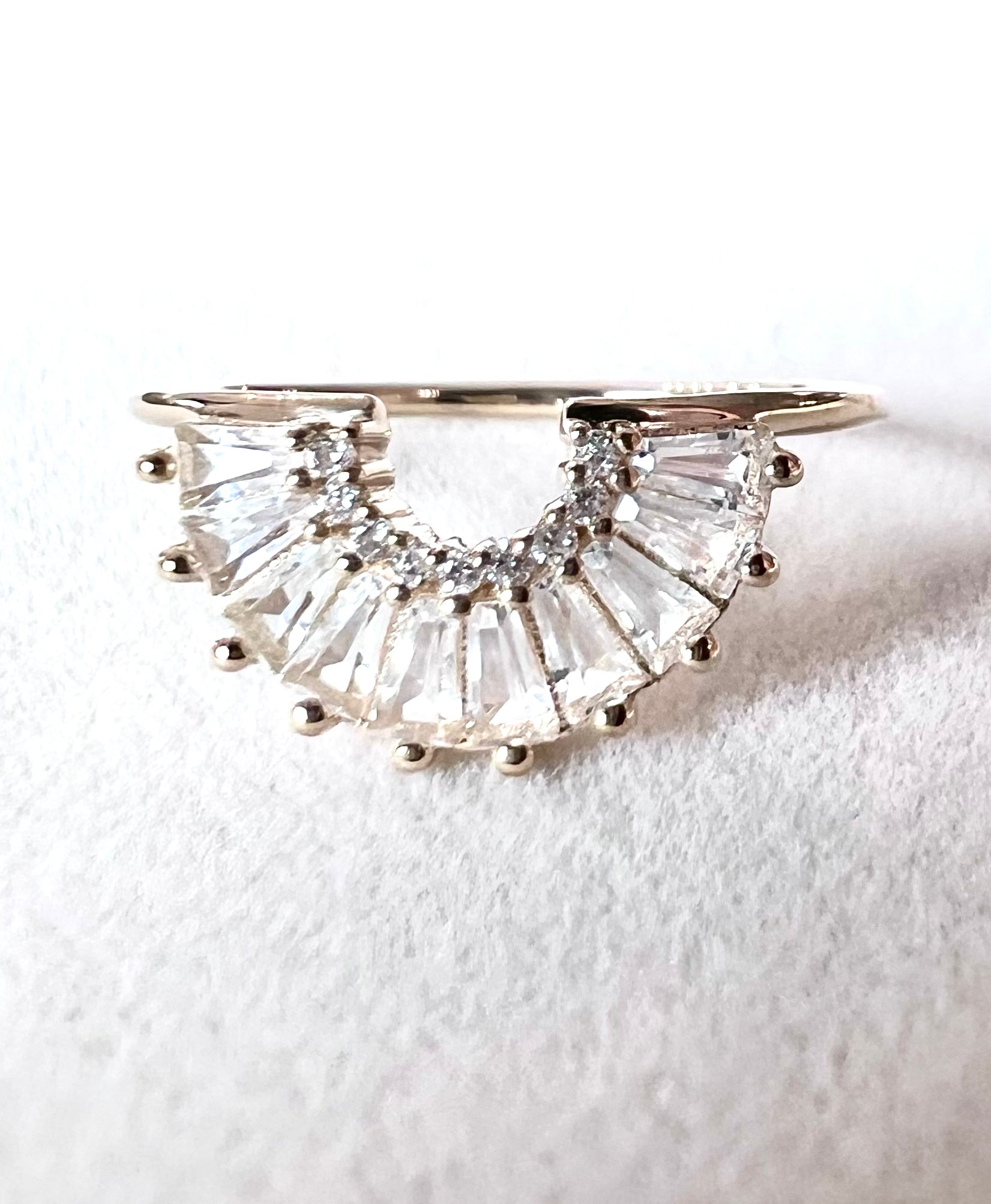 Crafted in luminous solid 14kt gold, the Illuminating Baguette Arc Ring is a stunner. A halo of brilliant VS1 white diamonds (each ~1.4mm) crowns natural baguette-cut white topaz (4×2mm). Each stone is hand-set to ignite with every flicker of light. The effect is nothing short of mesmerizing - bold, radiant, and destined to endure.