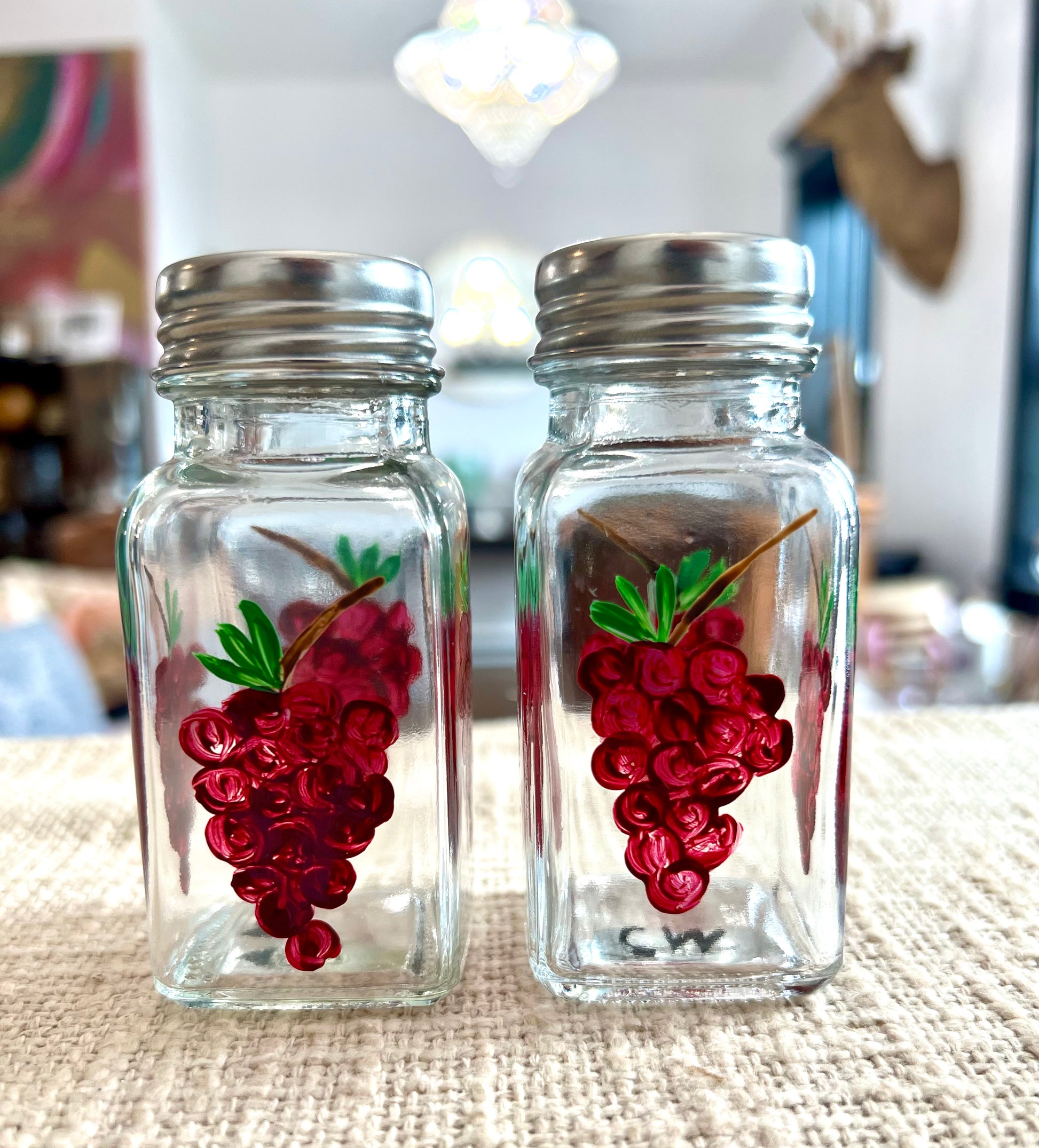 Add a little charm to your table with these delightful salt and pepper shaker sets, each hand-painted by artist Carol Moore. Featuring bountiful grapes, no two sets are exactly alike—each one a tiny, functional piece of art. This S&P set brings a burst of color and whimsy to everyday meals, whether on a cozy breakfast table or a sunny party spread. Crafted with love, these shakers are perfect for gifting...or keeping.