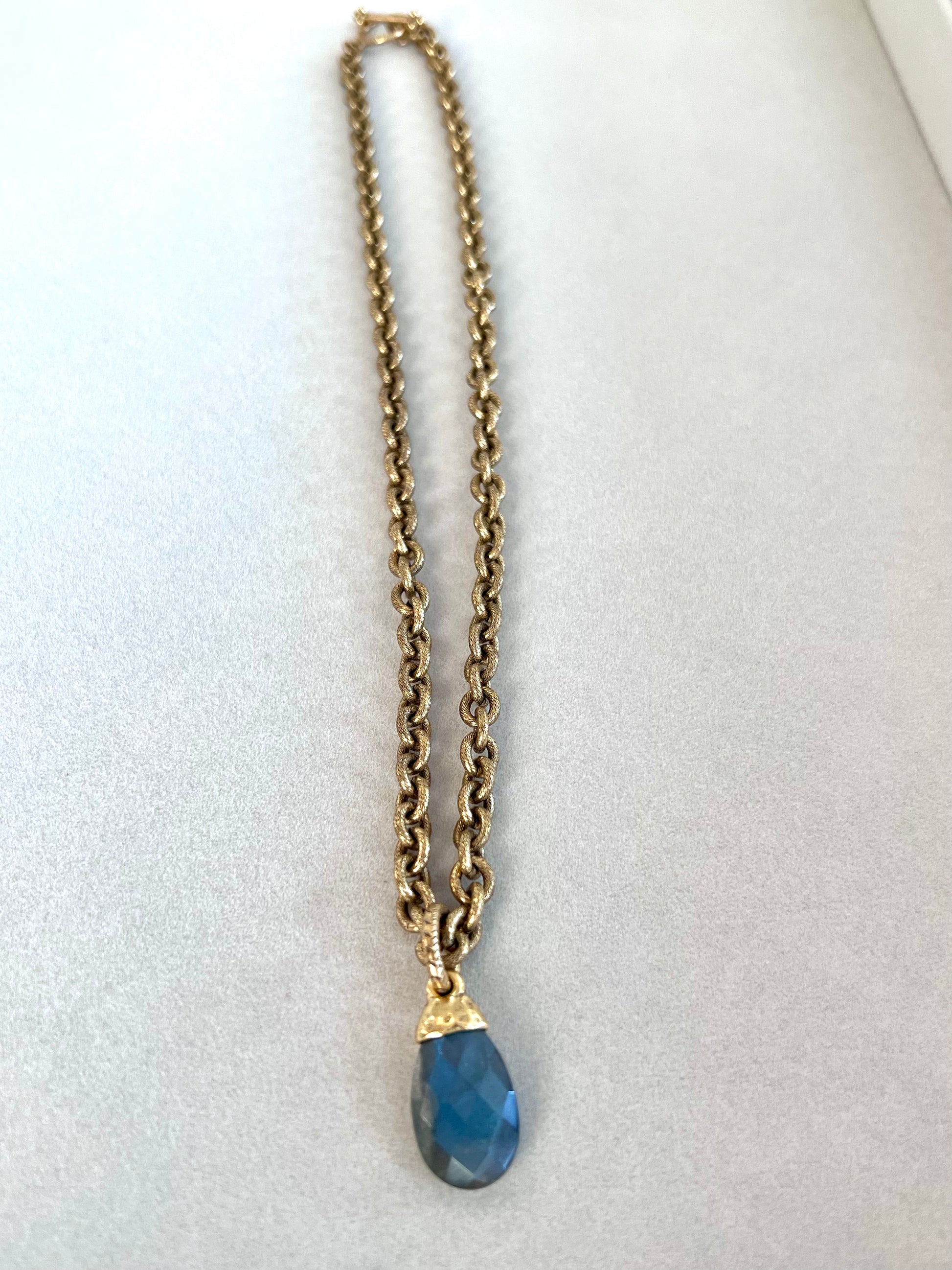 This necklace brings an irresistible edge with its genuine labradorite briolette, flickering light with its unique glow and depth through perfectly faceted cuts. Suspended from a 17" vintage-inspired 12K gold-finished chain with a toggle closure, this necklace carries a touch of mystery and an edge that’s anything but ordinary.