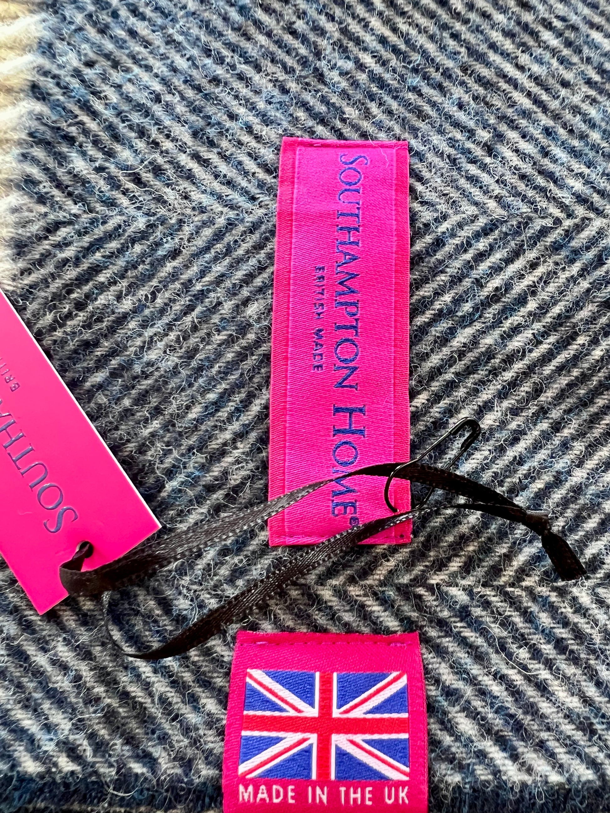 A blanket that feels like heritage and comfort woven together. Crafted in England from 100% pure New Zealand Shetland lambswool, this herringbone throw is soft, lightweight, and naturally hypoallergenic. With a generous size of 55" x 72", the navy-and-white classic herringbone pattern and its crisp white fringe bring comfort and elegance to any room - draped across a sofa, folded at the foot of your bed, or tucked into the car for weekend escapes.