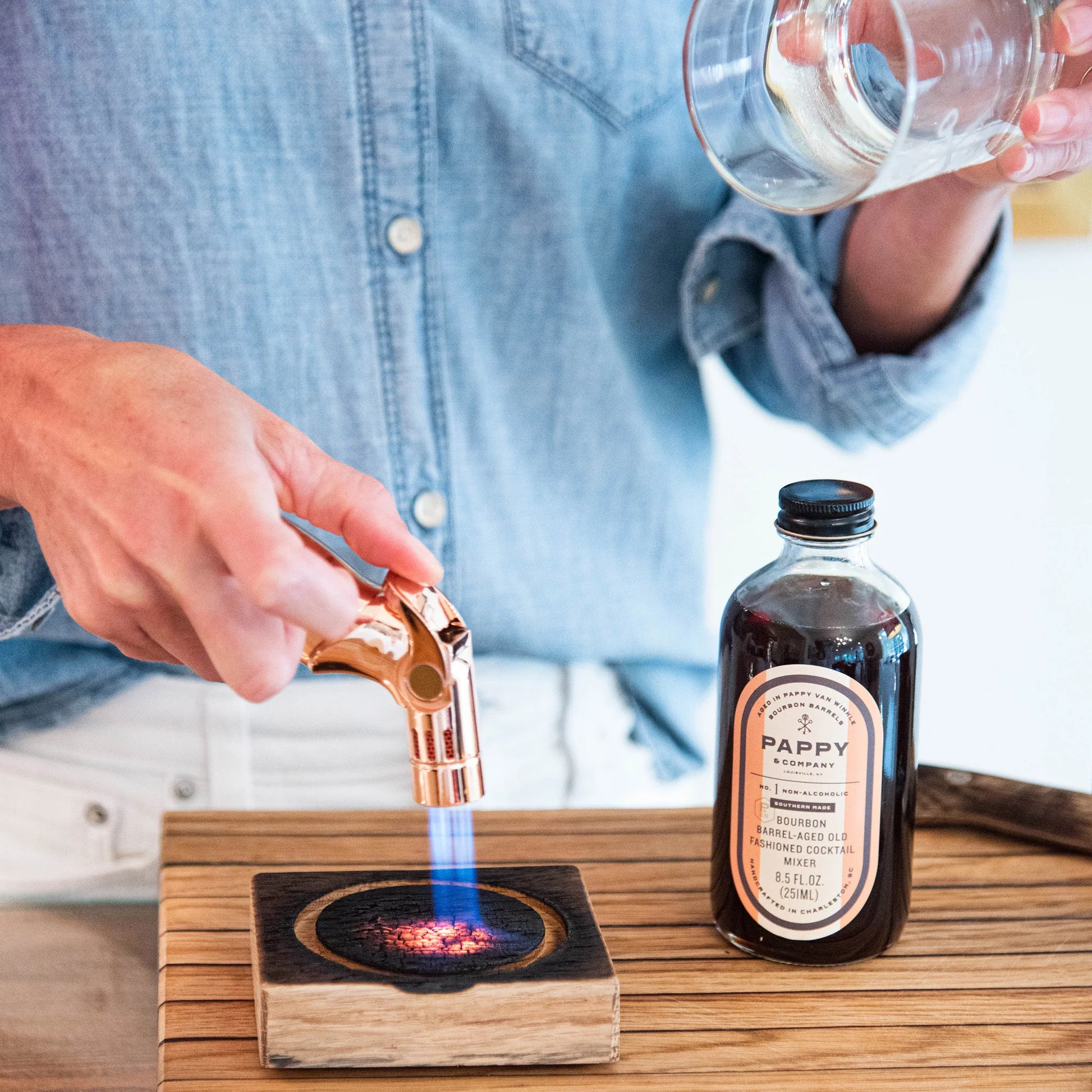 Cocktails are more than a drink, they are a sensory experience. With this exclusive smoked cocktail kit, you can bring a touch of speakeasy drama into your own home bar. Inside, you’ll find an authentic Pappy Van Winkle whiskey barrel stave, a custom culinary torch engraved with the Pappy & Company mark, and a pair of heavy 8-ounce rocks glasses, made to rest perfectly over the smoldering wood.
