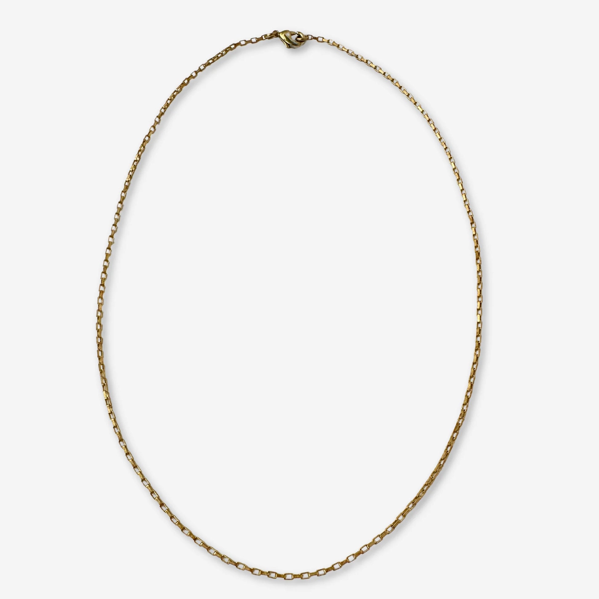 This simple 18" rectangular box chain in raw brass is the perfect base to create your own signature look. It closes with a lobster claw clasp for effortless wear.