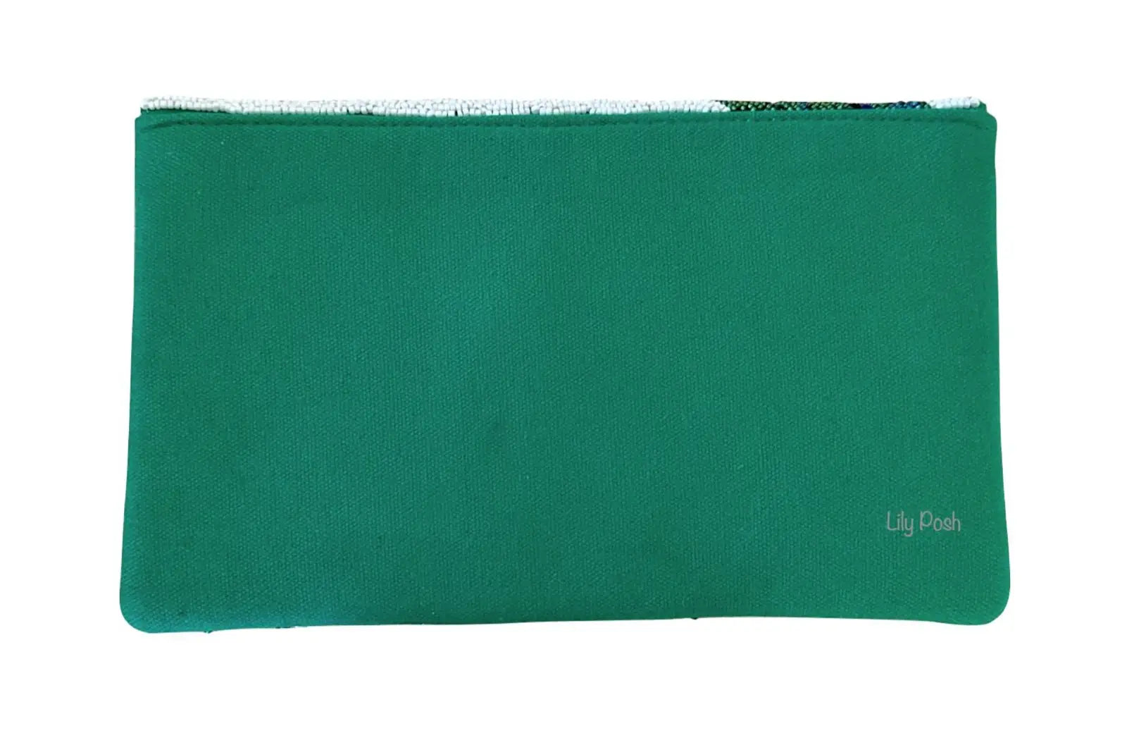 Bring the tropical life out with you. This handmade beaded clutch is covered in lush tropical leaves on the front, finished with a matching bright green cotton back and interior that feels like carrying a secret lush garden. A magnetic clasp keeps it secure, while the interior card pocket holds just what you need.