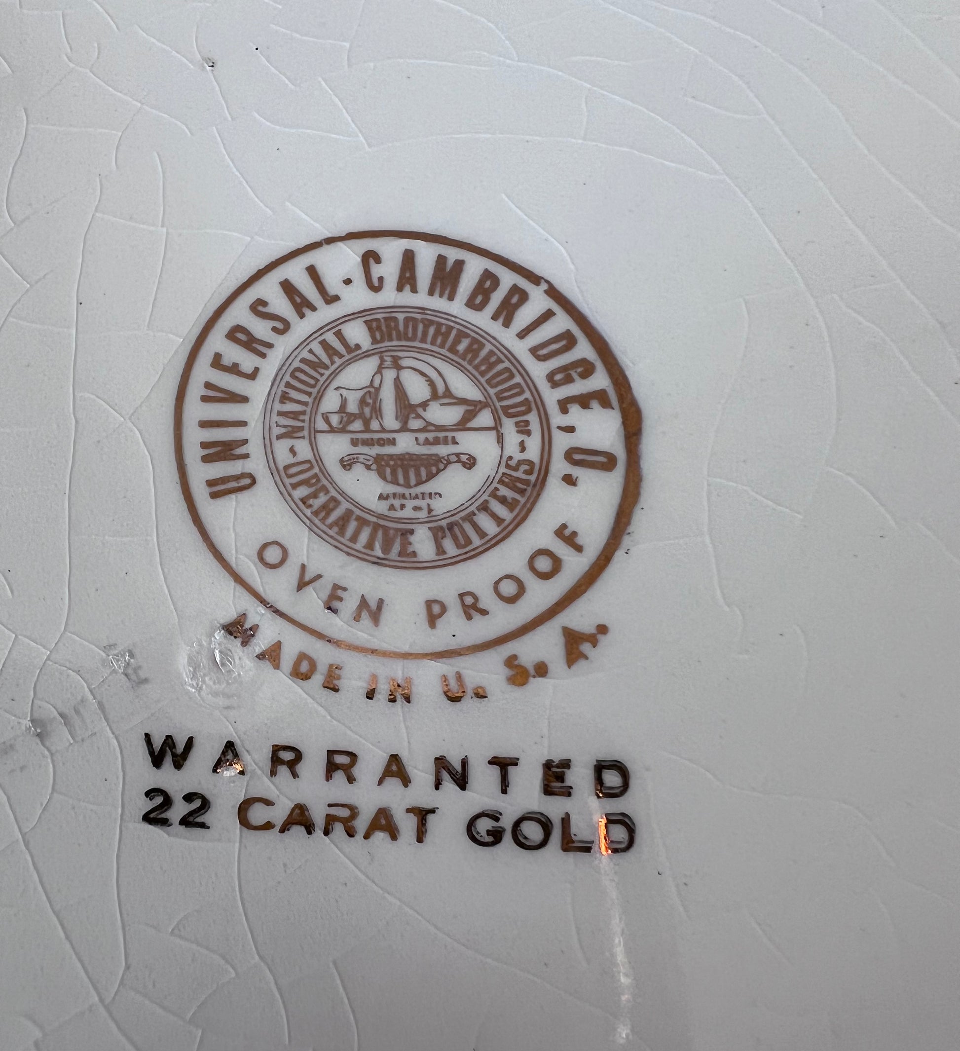 This particular quintessential piece of mid-century Americana has a refined spirit. This ivory set features a broad, beautifully contoured bowl, with a delicate 22 carat gold rim. The exterior is quietly distinguished by “Tom & Jerry” rendered in classic 22 carat gold lettering. The six accompanying cups each display "Tom & Jerry" rendered in soft, 22 carat gold vintage lettering. Stamped on the bottom is its heritage mark "Universal Cambridge, National Brotherhood of Operative Potters, Made in the USA." This set evokes the quiet sophistication of a countryside lodge or a heritage club, perfect for serving warm holiday eggnog or classic punch. Ideal for collectors with an eye for history, or for those who appreciate a graceful, storied piece that complements an elegant, lived-in home.