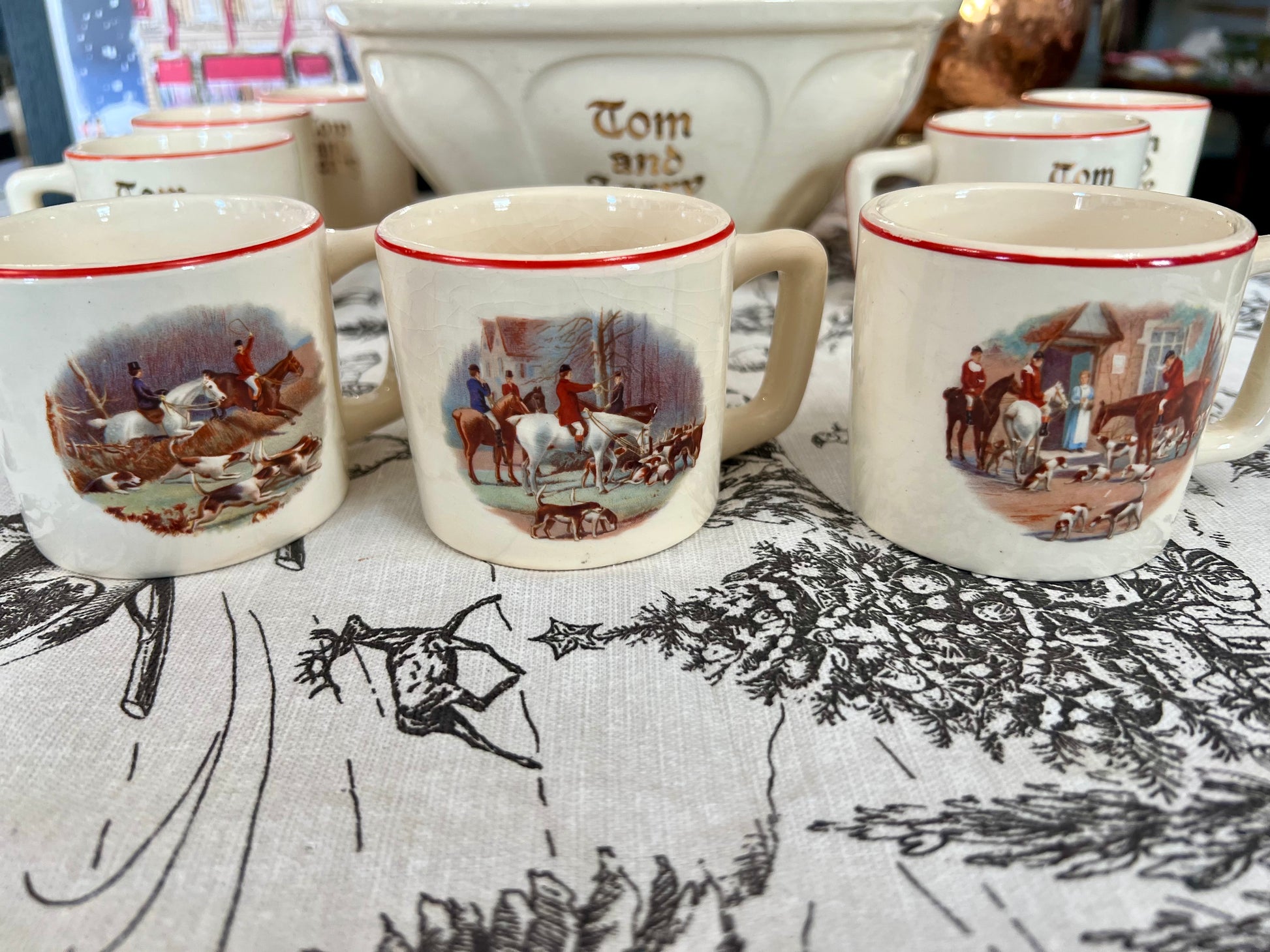 Elevate your gathering with this distinguished and timeless Vintage Tom & Jerry Hunting Scene Punch Set from Universal Potteries, Cambridge, Ohio.