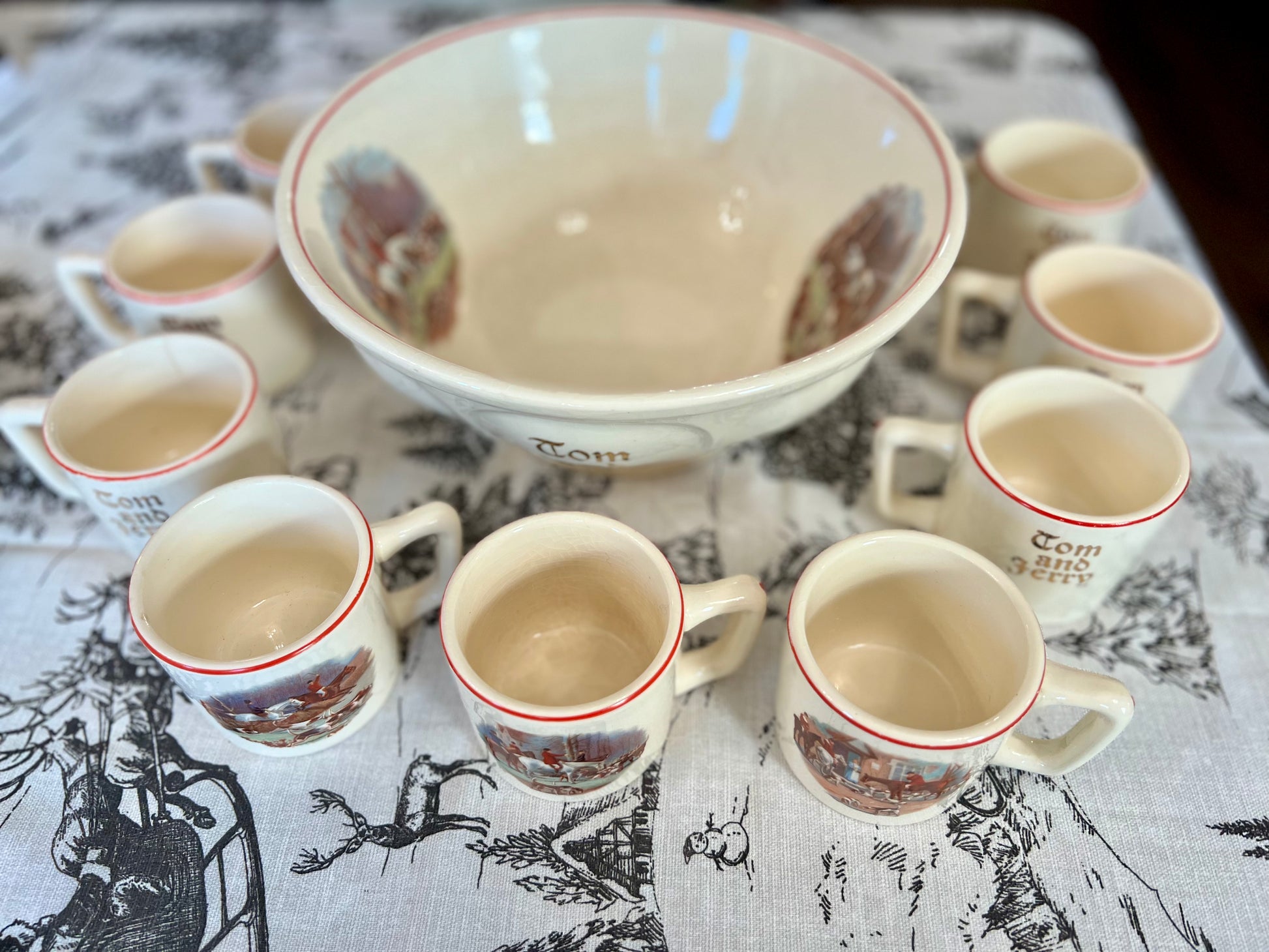 The term Tom & Jerry refers not to the lovable cartoon cat and mouse, but to a traditional holiday drink - a rich, frothy eggnog beverage made with eggs, sugar, milk or cream, and often warmed and spiced with nutmeg, rum, or brandy. It rose to popularity in 19th- and early 20th-century America, as a festive, convivial drink. This ceramic punch set of bowl & mugs was designed to serve that very drink. The large bowl holds the warm, aromatic mixture, and the individual mugs make for easy and elegant serving. Beyond holiday use, the pieces lend themselves beautifully to warm punches, mulled cider, or simply as decorative collectibles, a perfect blend of form, function, and tradition.